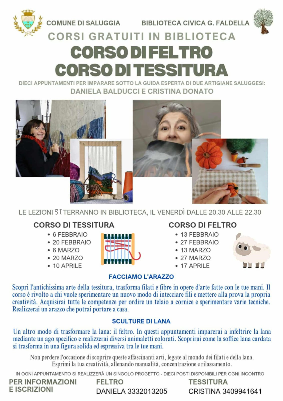 corso di feltro e di tessitura a cura di daniela balducci e di cristina donato. data: tutti i venerdì dalle 20.30 alle 22.30. luogo: biblioteca civica g. faldella di saluggia. iscrizioni: feltro: balducci – 333 2013205. tessitura: donato – 340 9941641.