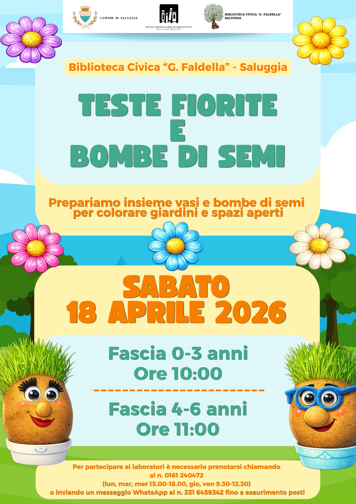 laboratorio "teste fiorite e bombe di semi" a cura di chiara falciola. data: sabato 18 aprile 2026. orario: 10:00 - 11:00. luogo: biblioteca civica g. faldella di saluggia. richiesta prenotazione al numero 0161 240472 o via whatsapp 331 6459342.